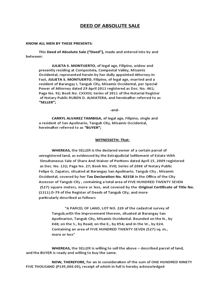 Download Deed Of Sale House Pics A sale deed of house property is created between the buyer and seller for the purchase and sale of an agreed agricultural land, plot or resale of flat. The sale deed, from the seller to the buyer, is the primary document evidencing ownership and vesting absolute title to the property. Deed of absolute sale of real property. If the sale deed which proves seller's ownership of property in present is not available with seller, the buyer hesitates to buy the property. A deed of sale (or grant deed, bargain deed, etc.) is required to get title insurance on your purchase. The deed also spells out the details of what exactly the sale includes.